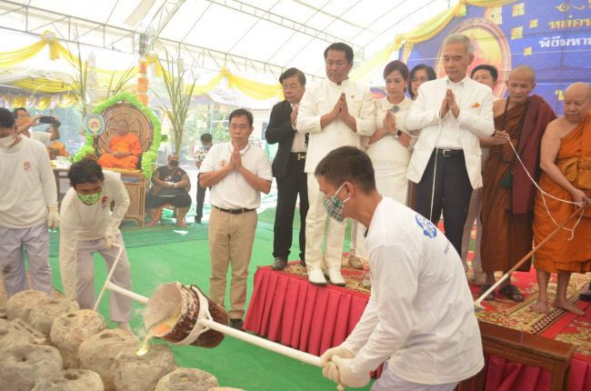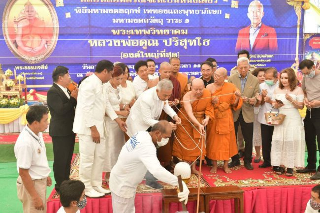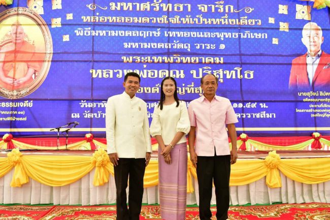 นายสุวัจน์ ลิปตพัลลภ อดีตรองนายกรัฐมนตรี ประธานในพิธี เททองหล่อรูปเหมือนพระเทพวิทยาคม(หลวงพ่อคูณปริสุทโธ)องค์ใหญ่ พร้อมด้วย นายไพฑูรย์ มหาชื่นใจ นายอำเภอด่านขุนทด