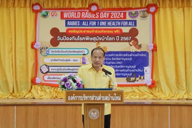 วันนี้ (26 กันยายน 2567) เวลา 09.00 น. ร้อยโท ทศพล ไชยโกมินทร์ ผู้ว่าราชการจังหวัดกาญจนบุรี มอบหมายให้ นายรณภพ เวียงสิมมา รองผู้ว่าราชการจังหวัดกาญจนบุรี เป็นประธานพิธีเปิดโครงการ “วันป้องกันโรคพิษสุนัขบ้าโลก ปี พ.ศ. 2567” (World Rabies Day 2024) ณ องค์การบริหารส่วนตำบลบ้านใหม่ อำเภอท่าม่วง จังหวัดกาญจนบุรี โดยมี นายสามารถ ประสิทธิ์ผล ปศุสัตว์จังหวัดกาญจนบุรีกล่าวรายงาน ฯ นายสรายุธ จีนาภักดิ์ นายกองค์การบริหารส่วนตำบลบ้านใหม่ กล่าวต้อนรับ หัวหน้าส่วนราชการ ผู้แทนส่วนราชการ เจ้าหน้าที่ และประชาชน ร่วมเปิดโครงการ ฯ